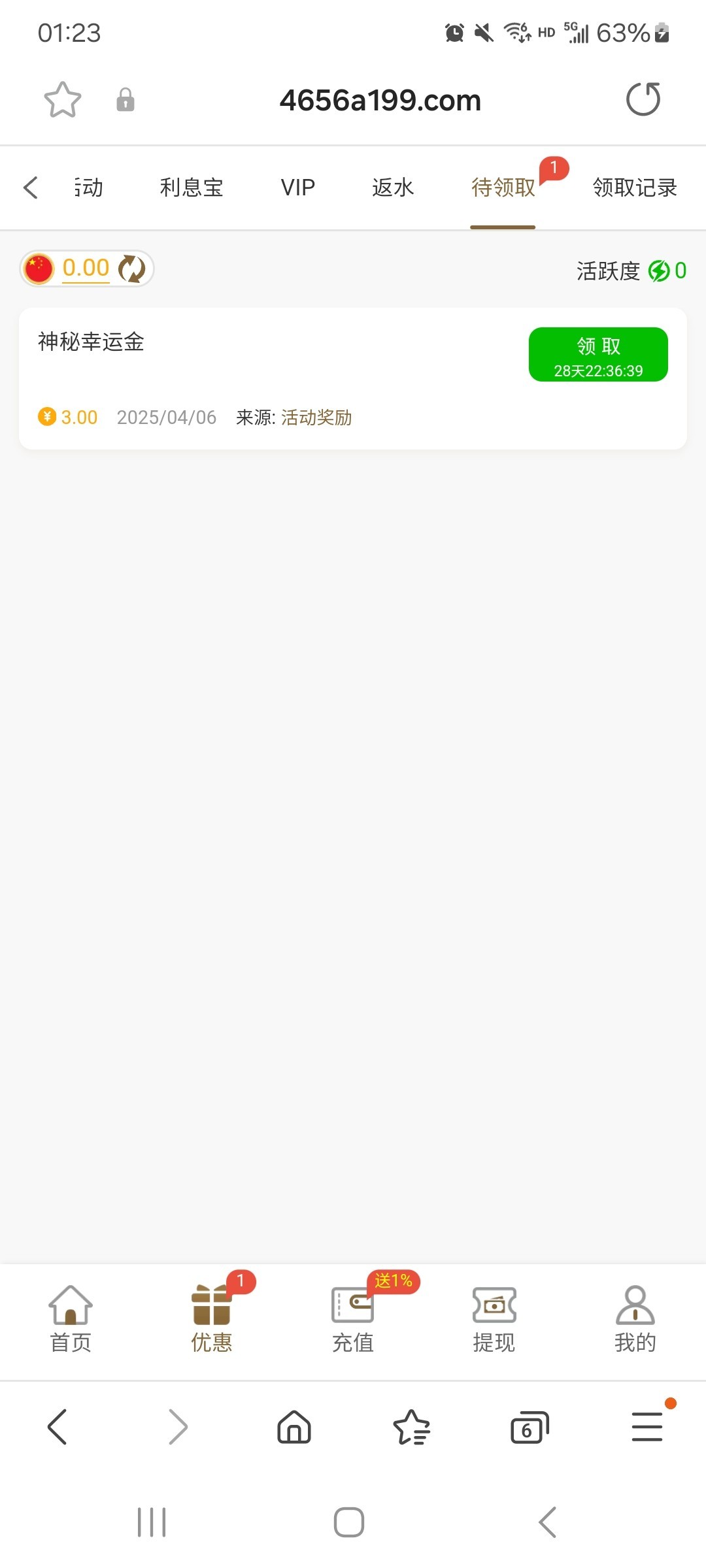 有号的登录看看,优惠里面领取。这台子十块就能提。链接 4656.com
