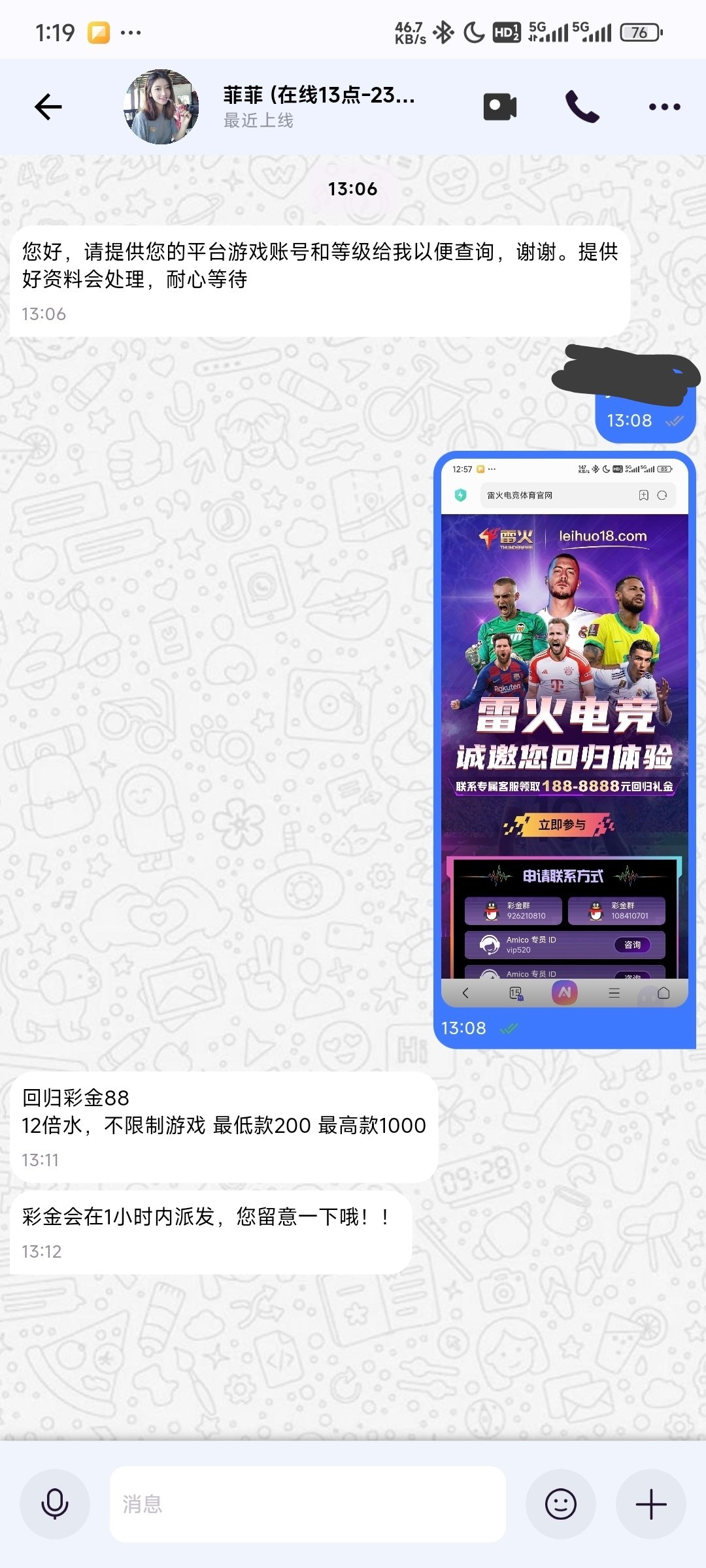 雷火回归彩金,我是收到短信的没充值过给了88,自己去加专员碰瓷一下