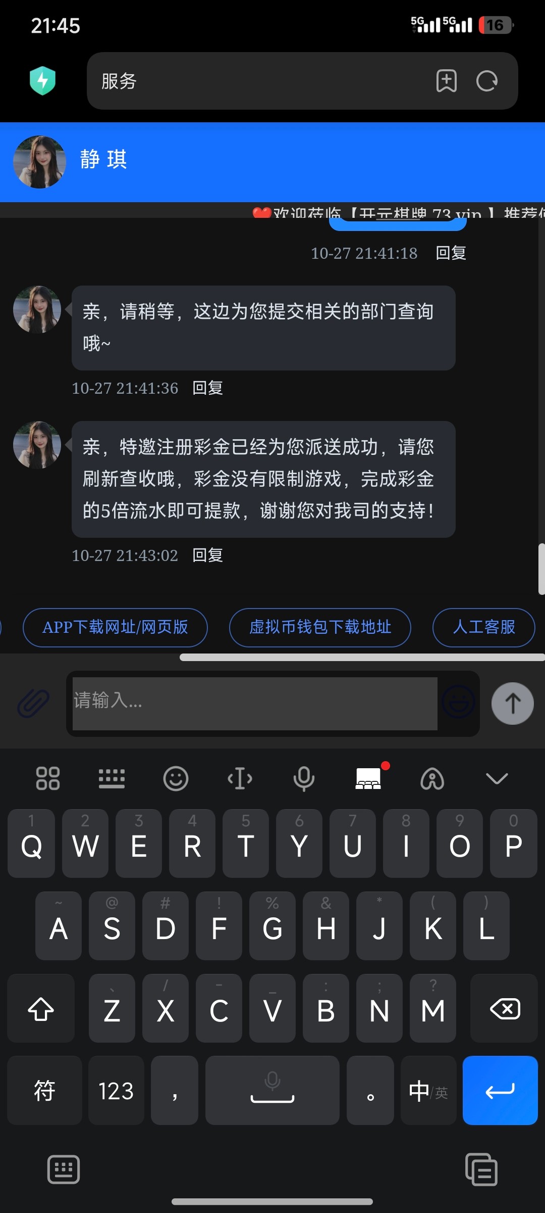 注册好直接找客服点右下角人工客服输入ID和微信截图,直接到账5倍可出