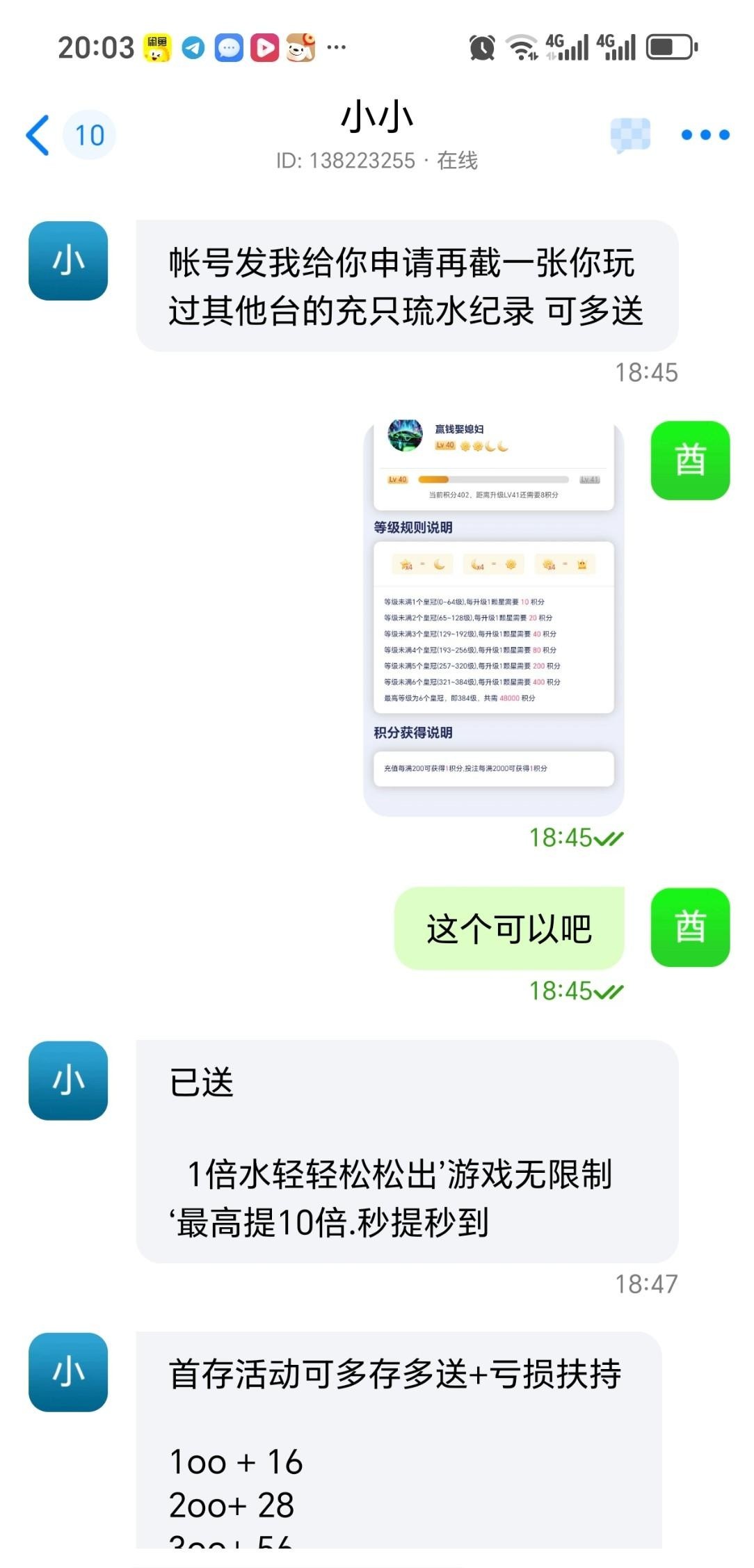 特邀网址14t.fuzhlnx.top 打开联系蝙蝠或者三条客服领取他会给你发注册网址和邀请码 给他一张其他平台的流水截图就行我给的是28圈等级截图送了48一杯流水提款最高提彩金10倍我没打出来 赶紧去现在应该不查