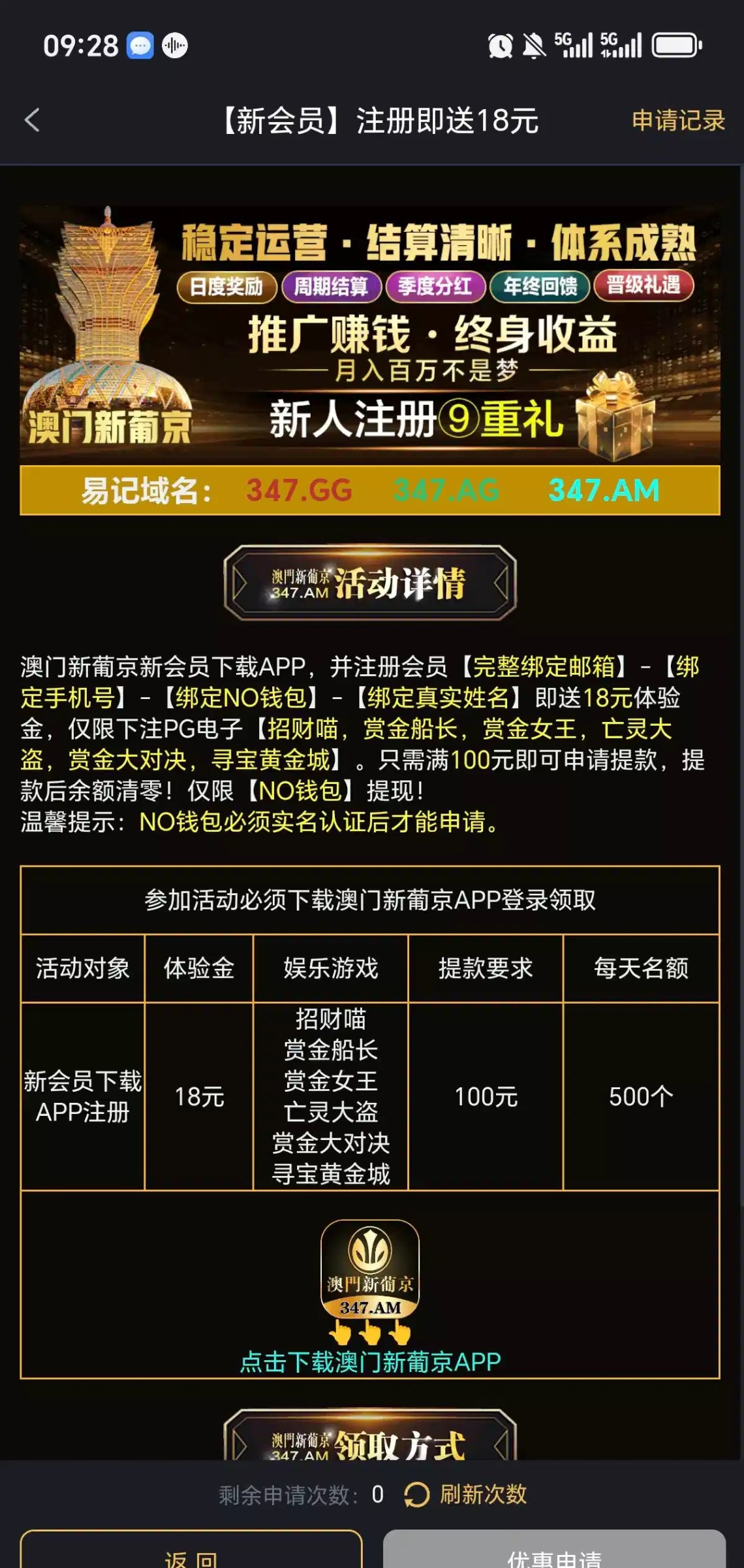新用户下载app注册送18,要绑定no钱包,钱包要实名,有游戏限制了,没打出来,最多提100,链接:347.gg